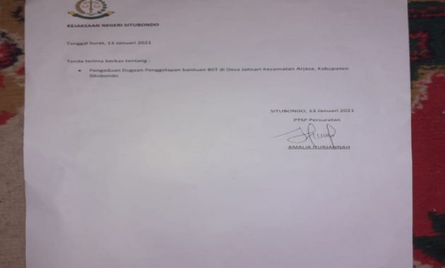 SITUBONDO, Persindonesia – Warga miskin desa jati Sari kecamatan Arjasa kabupaten Situbondo provinsi Jatim, khususnya warga dusun Bandusa ,Dusun Polai dan Dusun Canpalok, yang Medan lingkungannya dikatagorikan wilayah gunung , pada tanggal 13 januari tahun 2021, yang dibuktikan dengan surat tanda terima laporan, warga miskin penerima program BST untuk tahun 2020, yang jumlahnya sekitar kurang lebih 30 orang mendatangi kejaksaan negri situbondo, untuk membuat laporan, terkait dugaan penggelapan dana bantuan bansos yang Rp.600 ribu selama tiga tahap. Dan 300 ribu kelanjutannya mereka kecewa dengan tim covid desa jatisari yang tidak menyampaikan dana tersebut sesuai prosedur,artinya tanda kutip tidak diberikan kepada warga yang terdaftar dilink kementerian,