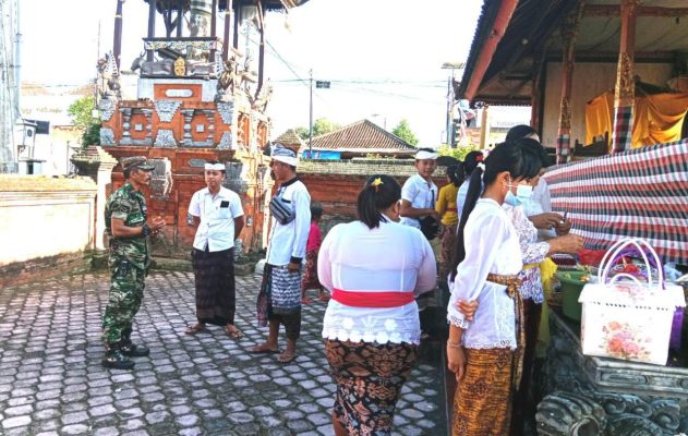 Persindonesia.com Jembrana – Guna menjamin keamanan dan kelancaran saat umat Hindu melaksanakan persembahyangan hari raya Kuningan Babinsa jajaran Kodim 1617/ Jembrana bersinergi dengan Pecalang serta aparat terkait terjun langsung ke pura yang menjadi pusat pelaksanaan persembayangan dimasing masing desa binaannya. Kehadiran Babinsa tersebut selain mengamankan persembahyangan juga untuk memastikan penerapan protokol kesehatan tetap dipatuhi walaupun status PPKM telah di cabut Pemerintah.