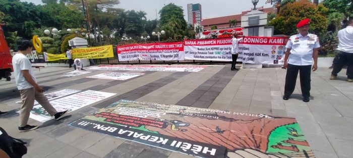 Surabaya, Persindonesia.com– 10 November 2025 Ratusan warga pemegang Surat Ijo di Kota Surabaya menggelar aksi damai bertajuk “Aliansi Aksi 10 November 2025 Wadul Presiden Prabowo” pada peringatan Hari Pahlawan, Senin (10/11/2025). Aksi yang dimulai di Monumen Tugu Pahlawan itu merupakan bentuk protes atas belum tuntasnya penyelesaian konflik agraria terkait status tanah Surat Ijo yang telah berlangsung puluhan tahun.