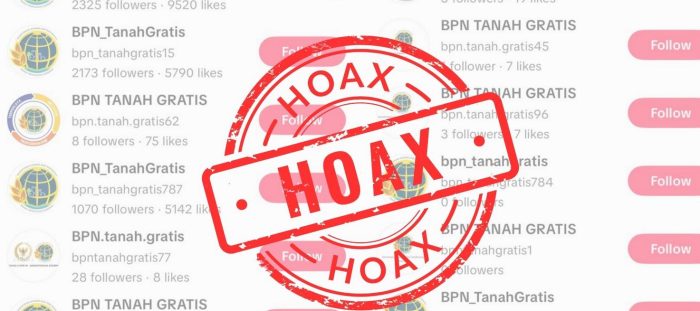 “Kami menegaskan, informasi yang beredar soal ‘tanah gratis dari BPN’ melalui TikTok adalah hoaks. Masyarakat jangan tergiur dan jangan klik link mencurigakan dari akun tidak resmi. Semua informasi resmi hanya melalui situs atrbpn.go.id dan akun media sosial resmi kami,” ujarnya di Kantor Kementerian ATR/BPN, Selasa (19/8/2025).