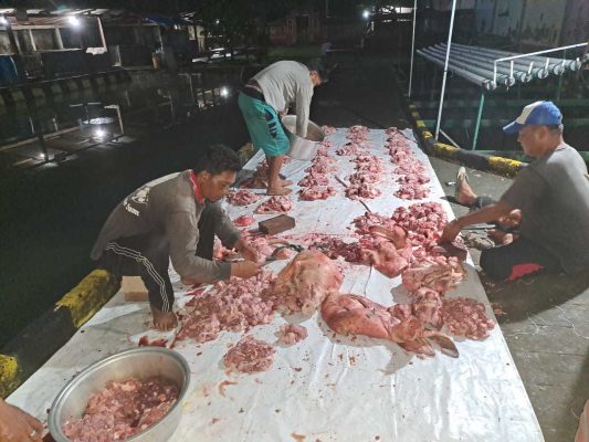Terlihat, 3 ekor babi tersebut yang beratnya rata-rata kurang lebih 3 kwintal tersebut dibagi rata menjadi 73 ‘tanding’ (jatah) yang dibagikan kepada 63 orang pegawai dan 10 orang keluarga WBP yang mengikuti pembinaan di pokja peternakan. Sebelum dipotong 3 ekor babi tersebut ditimbang terlebih dahulu.