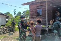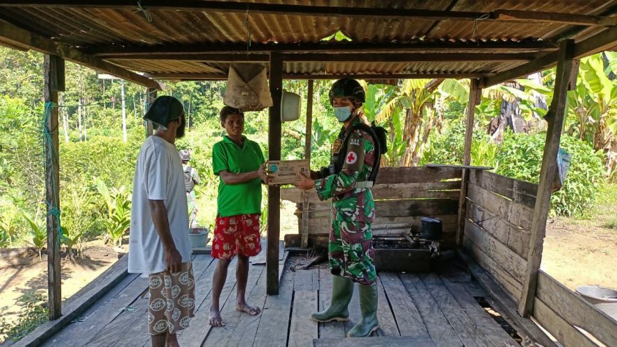 Dalam rangka meringankan beban masyarakat di tengah pandemi Covid-19, prajurit TNI dari Satgas Pamtas RI-PNG Yonif 131/Brs Pos berbagi kebahagiaan dengan membagikan paket sembako kepada warga Kampung Kibay Distrik Arso Timur Kabupaten Keerom, Papua.