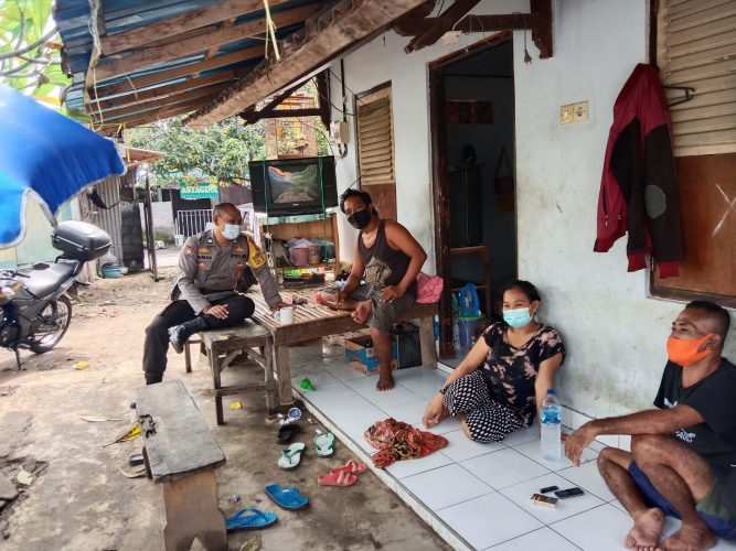 Bhabin menyampaikan himbauan agar tetap disiplin menjalankan protokol kesehatan dengan memakai masker baik dan benar, jaga jarak dan sering cuci tangan pakai sabun pada air mengalir guna memotong rantai penularan covid 19.